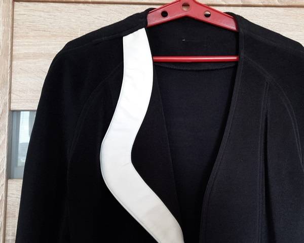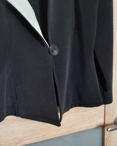 ŻAKIET-MARYNARKA damska, rozmiar M, czarny, niepowtarzalny fason, z oryginalną białą skóropodobną wstawką z jednej strony dekoltu, zapinany na jeden ozdobny guzik; lekko taliowany; piękny materiał, lekko rozciągliwy, nie wymaga prasowania, całoroczny. Doskonały do różnych stylizacji, bardzo praktyczny i zawsze swoim wylądem zwracający uwagę.